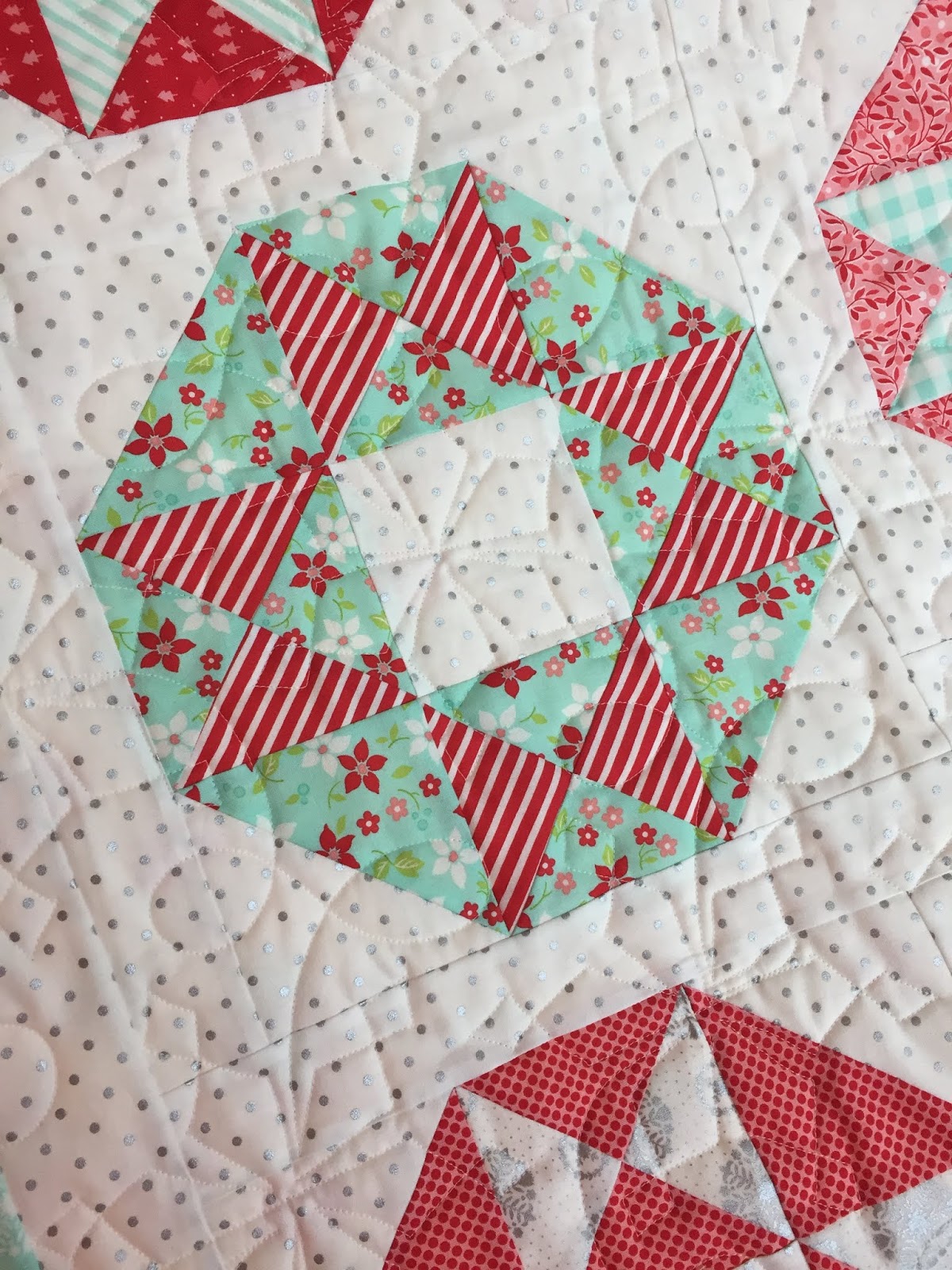 I love this quilt! I had been playing around with this block for a while, and adding the second print as an accent always reminded me of some sort of marble or rounded trinket with light glinting off of the angles. Like a jingle bell! So when I saw Bonnie and Camille's new line, Vintage Holiday, I knew that was the collection I would use to make this quilt, and it had to be called Jingle Bells!
