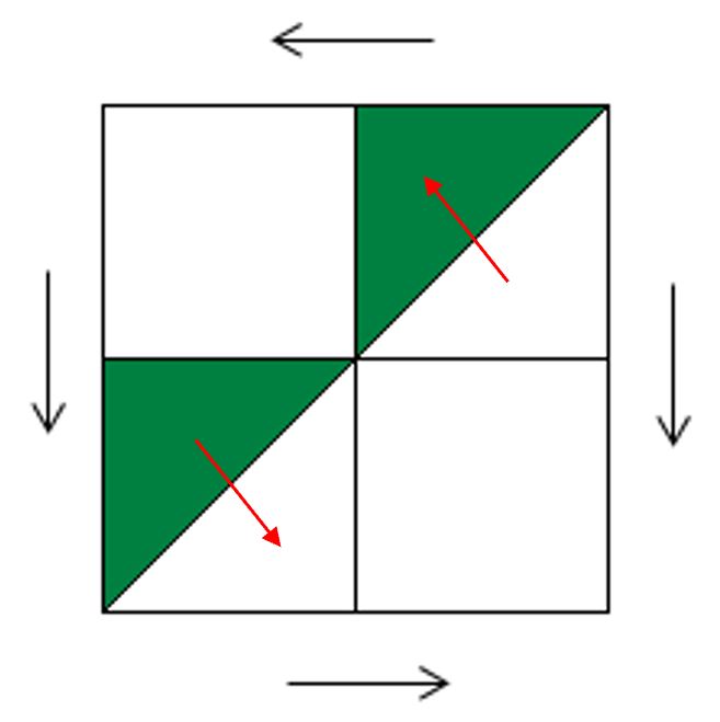 To continue making Unit A, join two more HSTs together as shown below. Make sure the diagonal seam of the HST on the left is pressed towards the green and the seam of the HST on the right is pressed towards the white, as indicated. Press the seam between the two HSTs to the right.